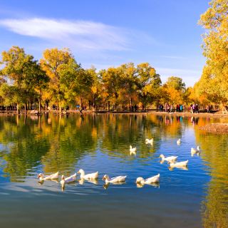 金塔胡杨林位于古丝绸之路中段北侧、甘肃省金塔县城西北6公里处,由胡杨林-金波湖核心游览区、沙枣林休闲观光区、瀚海红柳林保育区、沙漠娱乐体验区和沙漠芦苇迷宫区五个功能区组成,占地面积达8万余亩,景区内分布着西北地区大的"化石级植物"万亩胡杨林,极具观赏价值。金波湖碧波荡漾、金塔胡杨林金碧耀眼、沙枣花清香扑鼻、野生动物种类繁多、红柳红研秋醉、芦荻白花寒吹、沙滩柔绵、阳光迷人。来此地游览,您能充分领略大漠风情,鉴赏胡杨文化,探秘桐林幽境,体验沙瀚野趣,这里是集生态造林、防风固沙、餐饮娱乐、休闲度假、摄影创作、观光旅游为一体的旅游胜地,被评为甘肃省秋色美的地方。当大漠旷野吹过一丝清凉的秋风时,金塔胡杨林便在不知不觉中,由浓绿变为浅黄,继而变成杏黄了。登高远眺,金秋的海洋,令人心旷神怡。落日苍茫,晚霞一抹,胡杨由金黄色变成金红,后化为一片褐红,渐渐地融入朦胧的夜色之中。一夜霜降,金塔胡杨林如香山枫叶一样火红,像在熊熊燃烧。而每一棵高大的胡杨树冠枝头,间或又有浅绿、淡黄的叶片在闪现,错落有致,色彩缤纷。秋风乍起,胡杨金黄的叶片,飘飘洒洒"哗哗"地落到地面,大地铺上了金色的地毯,辉煌而凝重。漫步在这里,就仿佛进入神话中的仙境。茂密的胡杨千奇百怪,神态万般。粗壮的胡杨几个人难以合抱,挺拔的有七八丈之高,怪异的似苍龙腾越、虬蟠狂舞,令人叹为观止。密密匝匝的树叶,也是风采独具。幼小的胡杨,叶片狭长而细小,宛如少女的柳叶眉,人们常常把它误认为柳树;壮龄的胡杨,叶片又变成卵形或三角形,犹如兴安岭的白桦;进入老年期的胡杨,叶片才定型为椭圆形,更有甚者,在同一棵胡杨树冠的上、下层次,还生长着几种不同形状的叶片,可谓奇妙绝伦。
