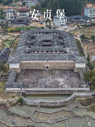 安贞堡建于清末光绪年间,当时匪患四起,当地乡绅池家父子建此土堡以抵御土匪,历时十四年完工。据说池家父子建堡前曾多次进京观摩皇城的建筑风格,回来后有所借鉴,亲自设计了这座客家围楼。安贞堡座西朝东,前部呈方形,后部为半圆开,依山而建,逐渐升高,远远望去层次分明,气势非凡,称其为城堡毫不夸张。安贞堡墙厚宅深,外墙用厚石垒砌加土夯制;安贞堡前有一块可容数千人的露天练兵场;安贞堡正面两侧有凸出5米的角楼,内墙四壁布有180个射击孔和90个眺望窗;正门则有木板门和铁门前后两重,顶上设有两处灌水孔,防范火攻。几近完美的防御设计在当时使得建筑固若金汤,无怪其在历史上多次成功抵御了土匪的围攻。安贞堡正门为一道用巨石砌成丈余高拱形大门,上有“安贞堡”三个大字,两旁书有楹联:“安于未雨绸缪固,贞观沐风谧静多。”内部建筑为二进,左右对称,随地势逐次升高,远眺其屋顶层层叠叠,错落有致。房屋分为上下两层,每层有内走廊,厅、堂、卧室、书房、粮库、厨房、厕所齐全,还有水井和下水道,可容千余人居住。安贞堡内装饰华丽,雕刻、彩绘、泥塑和壁画随处可见。安贞堡内石阶梯层级皆为单数,被视为阳数;楼梯和窗棂条数目必为“九”的倍数;堡内前天井大、后天井小,两者相合,似“昌”字,象征“兴旺”;在主楼天井中部的出水处,有螃蟹形状的滤水饰件,寓意保护住宅“财富”…;…;古堡中暗合传统布局之说的细节不少,不失为参观中的小小趣味。
