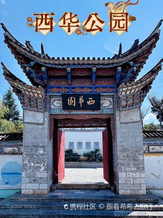 西华园是融云南白族民居建筑和名花异木为一体的园林建筑群。整个公园的房屋、亭台、门楼等,都是仿照白族民居建造的,有“三坊一照壁”,也有“四合五天井”。那粉瓦、青砖、白墙以及墙上的素描山水画,无不洋溢着清新温馨之美,透露出白族民居古雅华丽的风格特色。