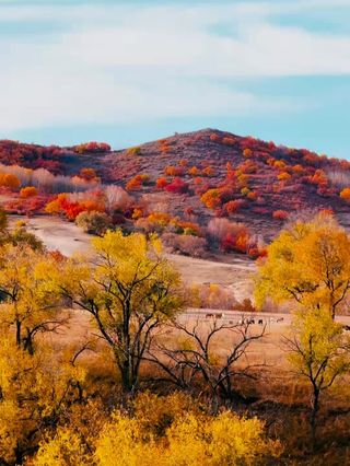 蛤蟆坝位于河北与内蒙古交界的克旗乌兰布统境内,是一块高起的平缓坡地,三边是“沟”或低地。这里多丘陵山地,地貌独特,秋天景色绚丽多彩,漫山遍野的红叶,流金溢丹,簇簇红叶中,明黄的白桦叶融合在一起,汇成一幅幅浑然天成的图画。在摄影人眼中,这是一个百拍不厌、常拍常新的摄影创作“宝地”。