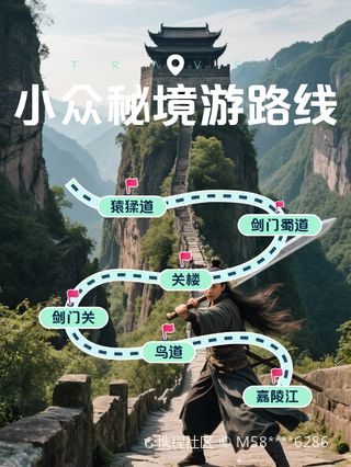 剑门蜀道,主要是指广元经剑门关、剑阁到绵阳这一线的风景名胜。剑门蜀道沿线古迹众多,可以观赏到三星堆遗址、德阳文庙、昭化古城、七曲山大庙等。古道雄伟惊险,山顶的玻璃栈道很是刺激,值得体验。