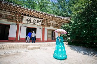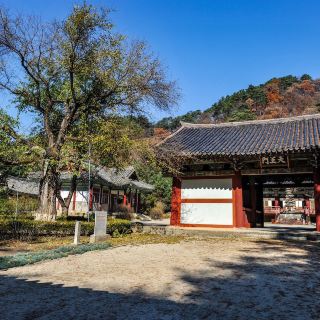 金刚庵坐落在通往妙香山路旁的普贤寺,建于公元1014年,寺前有冷杉、海松、水曲柳等多种树木。寺内主要建筑物有大雄殿、万岁楼、解脱门、天王门以及一座四角的9层塔、一座八角的13层塔。 大雄殿的墙壁很高,歇山式屋顶,仿流线型的粗腰房柱,神妙雕塑的装饰,显得和谐、端庄。殿内保存着13世纪刻印的6780卷佛教大经典,普贤寺八角13层的石塔就在此殿前面。万岁楼上保存有李朝时期500多年的政府日志《李朝实录》,是朝鲜的宝贵史料。普贤寺是朝鲜五大寺院之一,在朝鲜战争时期曾被美国飞机炸毁,现在的寺院是战后重新修建的。 在散珠和龙渊两大瀑布飞泻的岩盘上,坐落着著名的上元庵。此庵建于高丽时期(公元918~1392年),后遭毁坏,现在的这座老庙是1580年重建的。庵内有一棵盘根错节的老菩提树,树旁有一块打糕石,东边近处竖立着一块龙角石。上元庵楼台殿阁,古朴幽雅,与周围的自然景色十分和谐。