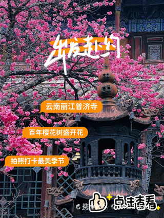 普济寺位于丽江古城区以西,距离县城6公里,是丽江五大寺之一。普济寺原有大殿、僧院等12个院落,现存3院,由山门、护法堂、大殿、南北厢房等组成。在教义上有融汉、藏宗教为一炉的特点。大殿前种有两棵云南樱花,至今已有200多年的历史,树粗一人抱不过来,每到春天,火红的樱花与寺周洁白的梨花交相辉映,分外娇美。