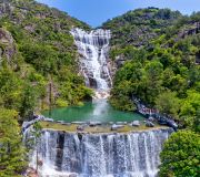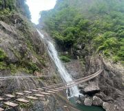 琼台仙谷景区位于天台县西北8公里处,是天台诸多景区中以花岗岩地貌著称的一处山谷。这里有清秀的湖水溪流和峻峭青翠的山岭,是天台百景中尤其值得一看的一个。琼台仙谷景区有上、下两个出入口,由于上入口附近有1公里左右的凌云栈道,十分陡峭,一般推荐上入口进,下入口(迎仙广场)出,一路下行,省时省力。由上往下2.5小时左右即可走完,反之则需要近4小时。两个入口之间有交通车往返,可乘班车至下入口后换乘交通车上山(步行约1小时),约1-2小时一班,10元每人。
