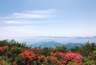 五龙山位于赣皖两省交界,主峰1580米,山高地沃,雨量充沛,山体宽厚,绵延小山如诸候朝圣般圃伏在周围,终年云雾起舞,壮如五龙,故得名。春天的五龙山,郁郁葱葱,山花烂漫,站在山顶俯视山脚的徽州村落。金黄的成片油菜花,曲曲的河流,流入如天镜一般的高山平湖。