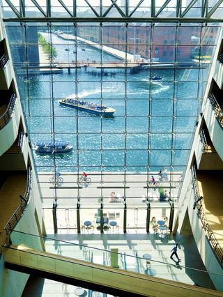 丹麦皇家图书馆的设计十分独特,一条大型分割线将大楼分成两个部分,中庭连接着城市与外面的大海,也连接着图书馆的新旧大楼,使得中庭光线充盈,敞亮。来到这里,你可以一睹丹麦著名大师Søren Kierkegaard的手稿,手稿珍藏于皇家图书馆Søren Kierkegaard档案厅,保管的非常精密。
