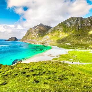 Haukland Beach位于莱克内斯以北10公里处,自驾约15分钟车程,不少关于罗弗敦的经典照片都来自于此。沙滩的沙质非常幼细,水质清澈,不过浪有点高,需注意安全。沙滩北面是一座山坡,没有明显的徒步径,但攀登难度不算大,能俯瞰沙滩及远处起伏的山峦以及壮观的海岸线。