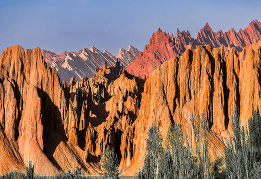 "红褐色的山体,奇峰异石"