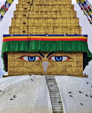 博达哈大佛塔是当地有名的建筑,坐落于加德满都东北面,是全世界知名的大型圆佛塔。 1. 博达哈大佛塔外观气势不凡它拥有白色巨大的穹形,气势不凡,给人以宽大为怀的感觉。在宏大的白色覆钵上有个方形塔,四面都画有巨大的佛眼,表示佛法无边,无所不见之意,佛眼上面是座金色的尖塔。塔基外缘刻有百余尊阿弥陀佛的小浮雕,小佛像沾染着红色涂料及戴着黄花。