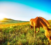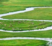闪电湖京北湿地草原位于沽源县,闪电湖是滦河上游大的湖,因入湖前的河流为闪电河而得名,在高处俯视,湖的形状也极像一道闪电。闪电湖湖水不深,清澈见底,水草飘摇,偶尔能看见河虾在水中自由游戈,黑色和洁白的水鸟在水面上敏捷地起落,给黄昏里的湖泊点缀了几分生动。湖边万顷草滩,风景如画,置身于草青云淡、繁花遍野的茫茫碧野中,似有天穹压落、云欲擦肩之感。在湖边,游客还可以骑马在草原上驰骋,可以乘坐三角翼滑翔机在天空中翱翔,也可以攀登延绵的炭山,观日出日落,领略别具一格的草原风味,忘却都市的嘈杂和压力。