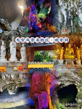 龙宫风景名胜区-观音洞位于漩塘河畔手山的山腰,是两个一上一下互相连接的天然洞穴,是西南地区大的洞中佛堂。下洞为大雄宝殿;上洞塑有观音菩萨及善财童子和龙女。上下洞共塑佛像27尊,尊尊神态逼真,栩栩如生,两殿香烟缭绕,平添了神秘肃穆气氛。洞外一垂直的峭壁上,刻着中国佛教协会主席赵朴初先生题写的“观音洞”三个大字。
