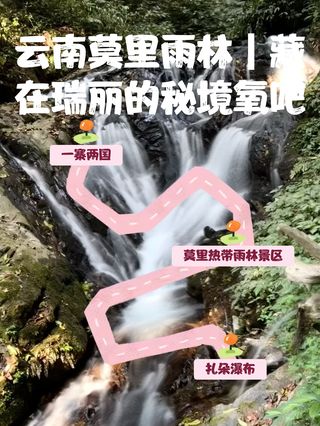 扎朵瀑布位于潞西、陇川、瑞丽三县市交汇的莫里峡谷,藏于山峦叠翠、万木峥嵘的亚热带雨林深处。清澈的泉水从40米高的悬崖陡壁倾泻而下,似一匹巨幅白绸在空中迎风飞舞,高峰悬崖间雪飞云涌,响声雷鸣,瀑布下又有一条小溪潺潺而过,是整个景区的灵魂,如果能在早晨日出时来到瀑布前观赏,实在是一种享受。