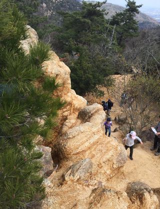 风吹岩海拔447米,是一个巨大的岩石,上面几乎没有植物生长。整个岩石呈黄色,点缀着棕色,在满眼绿色的山上显得格外的显眼。这里的视野不错,也是一个拍照休息的好地方。