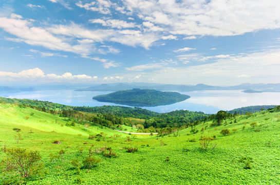 "俯瞰整个屈斜路湖和湖心岛"
