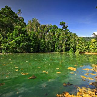 翡翠池位于国家森林公园内,这个公园是一处未经开发的热带雨林,这里植物繁茂并栖息着大量稀有的野生动物。 翡翠池湖水呈浅绿色,水温接近人体体温,是非常舒适的天然泳池。水流从缓坡流下,聚集在低洼处,湖水不深,大人站立湖中水位及胸。顺着天然小路继续前行,还可以抵达另外一处水质更加清澈的蓝湖,但是由于湖底比看起来要深得多,底部淤泥会使人陷进去,所以这里禁止游泳。