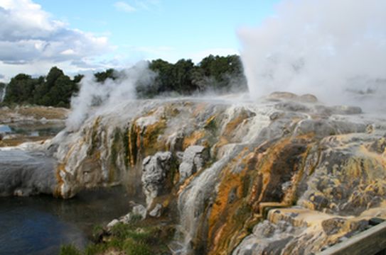 华卡雷瓦雷瓦地热保护区集温泉奇景于一身。区内烟雾弥漫,新西兰较大的间歇泉波胡图(Pohutu),泉水喷出高达30公尺,通常每天喷出20次,擎天水柱倾泻而出,蔚为奇观,成为罗托鲁瓦的地标。
