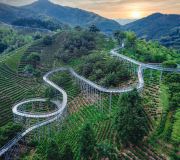 安吉黄浦江源漂流位于中国竹乡——浙江安吉县递铺镇鹤鹿溪村境内,漂流全程长达4.5公里。途中起伏落差适宜,时而水流平缓,时而急流险滩,一路行程,两岸风光旖旎、水面野鸭伏鹜、水底鱼虾助兴,水草伴随着竹筏摇曳。可谓一路行程一路景,田园风光横趣生。