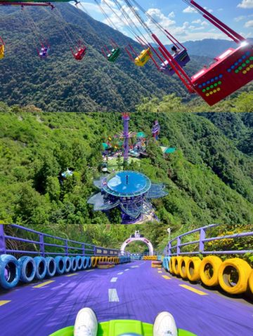 建在山里的游乐场,景色也很不错,上山有魔毯缆车溶洞,下山有飞车和超长玻璃道漂流,园区里面还有酒店可以住在这里,可以全天体验山间美景。