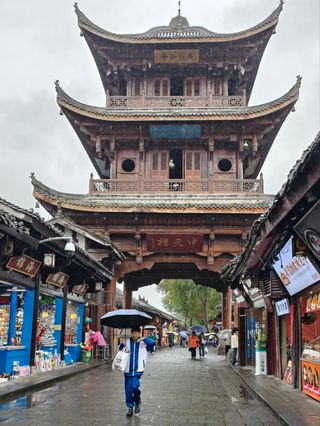 中天楼是一座始建于唐朝的三层明清建筑风格的木质高楼,楼高25米,在一大片古城区中拔地而起,气势恢弘,建造精美。它是阆中古城地理位置的中心和布局的关键所在,古城的街道就是以它为中心的,以‘天心十道’的形式向四面八方次第展开,因此也将之称为“阆中地理中心”。它位于阆中古城的双栅子街、北街、西街和武庙街的交汇处,又名四排楼,阆苑十二楼之一,是古城的环境布局坐标。它始建于唐朝,后被毁,2006年重建,楼高20.5米、共三层,楼门四通,它宏伟壮丽,气势非凡,与古城景观协调统一,从古城四个方向均可饱览它的丽姿;登上楼顶,视野开阔,古城的环境格局尽收眼底。