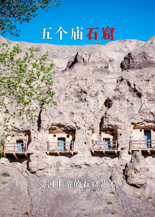 位于肃北蒙古族自治县城西北20公里,距敦煌90公里,因在崖壁上开凿有5个洞窟故名。创建于北周,宋西夏有重修。实有洞窟6个,现编有5个窟号,各窟造像均已毁坏,仅余壁画,也已漶漫不清。第1窟为中心方柱式建筑,大约始建于北朝,原有作品早已不存,现存壁画为西夏时重绘。有弥勒经变、水月观音、曼荼罗等内容。第2窟呈长方形,人字坡顶。所余菩萨、大王、弟子及供养人等,形象生动,艺术水平极高。