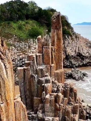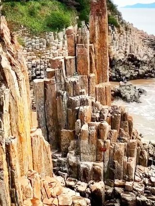 花岙岛位于象山南部的三门湾口洋面上,岛上峰俊石怪,岩奇洞幽,特别是布列在一公里海岸上的结晶体石林,气势雄伟壮观。各种细表条状石头密密麻麻靠在一起,排列有序,长短不一,粗者须两人方能合抱,高者达到五六层楼高;有的似倚天长剑,有的似临海之鹤,人称“仙人锯岩”。