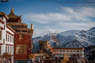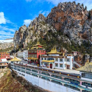 尕尔寺是一座直贡噶举派的寺院,坐落于一座海拔3700多米的高山上,分为上寺和下寺。山的北面全是奇峰怪崖、寒风料峭,但南边却是略有坡度、温暖向阳。尕尔寺的数百间建筑,就不规则的分布在山南边的这个大山坡上,从下至上,直到山顶。