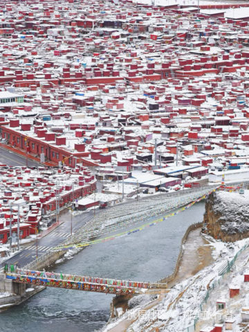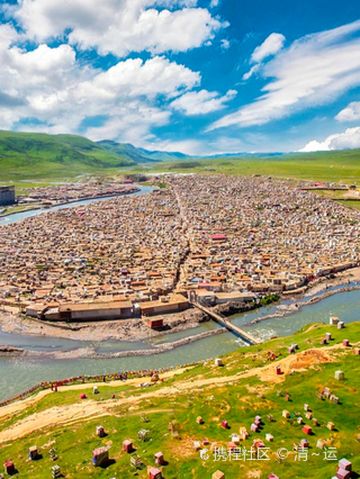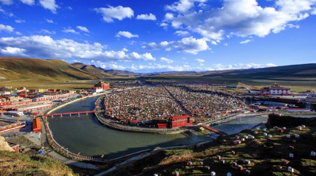 亚青寺,该寺始建于公元1985年。闭关修行者过万,以女性修行者为多,在康区与色达喇荣五明佛学院齐名。寺庙建在四面环山的草原湿地上,有数千间信徒居住的小木屋,纵横交错的河流包围了整个寺庙的建筑群,每当清晨或黄昏,炊烟弥漫,河水闪耀着金光,颂经声随风远远传来,犹如天籁,动人心弦。