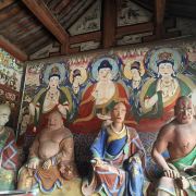 大同法华寺位于大同城内和阳街北侧,寺院坐北朝南。根据清道光十年(1830)的《大同县志》记载:此寺,“明时建,久废,砖塔存。”寺院占地面积57亩,共成四进式院落布局。沿中轴线主要建筑:山门、三士殿、大雄宝殿、法华塔、藏珍楼。三士殿两侧配殿为伽蓝殿和祖师殿,大雄宝殿东西建罗汉堂,其他建筑包括钟、鼓楼,游廊、配殿等。三士殿内供奉观音、文殊、普贤三大士菩萨。塑像灵活生动、面容祥和,东西壁绘有八大菩萨、十方佛,后壁绘有法华法会场景。大雄宝殿供奉三身佛。佛像庄严而坐,面容慈眉善目,温婉典雅,背光采用悬塑并绘有石绿、深蓝等颜色,使得立体感很强,烘托出佛的庄严,肃穆之感。山墙绘有水陆壁画,又称人神行进图。人物众多、形态各异,内容包括儒、释、道各色人等。