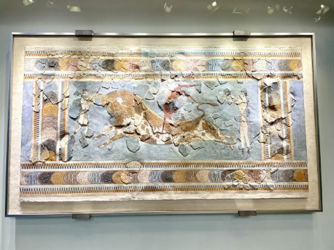 伊拉克利翁考古博物馆如同克里特文明时期的缩影,众多珍贵的出土文物被分列在16个展览馆,规模之巨毫不亚于雅典的国家考古博物馆。在博物馆的14、15、16室中,珍藏着从诺索斯宫殿遗址出土的壁画,比较有名的如戏牛者、百合王子、巴黎女子等,这些都是米诺斯时期文化的典型代表作。