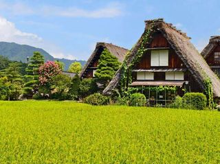 白川乡位于岐阜县西北部,于1995年被列入“世界文化遗产”。“合掌造”式民居屋顶呈三角形,是当地居民为了抵御严寒和大雪创造出的适合大家族居住的建筑形式。因屋的形状很尖,像一个合着的手,因而得名。