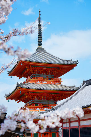 清水寺始建于778年,是京都较为古老的寺院之一,后于1994年被列入世界文化遗产名录。本堂前悬空的清水舞台是日本的珍贵文物,四周绿树环抱,春季时樱花烂漫,是京都的赏樱名所之一,秋季时又化身为赏枫圣地,红枫飒爽,无比壮丽。