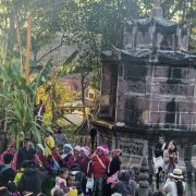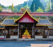 在世界茶文化圣山——普洱景迈山的怀抱里,八角塔如同一枚镌刻着民族交往印记的古玺,静置于澜沧拉祜族自治县芒景村芒洪大寨入口的台地上。这里曾是芒洪佛寺旧址,寺院已隐入时光,而这座清代八角塔依然伫立,现为全国重点文物保护单位“景迈古茶园”的重要组成部分。塔身采用当地红砂岩筑就,呈八方八角的独特形制,造型在以南传上座部佛教信仰为主的边地颇为罕见。塔分基、座、身、刹四部分,须弥座式的塔座上,两层塔身收分有致。塔身的雕刻叙事令人称奇:东门两侧是释迦牟尼说法的庄严场景;塔座八面镌刻着世俗吉祥图案;而顶层浅浮雕竟出现了道教“暗八仙”。二十三幅石雕里,汉地的祥云卷草、西南的山茶花、神话人物与佛本生故事同处一塔,各美其美。