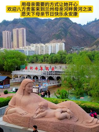 黄河母亲像位于兰州黄河南岸的滨河路中段,是全国诸多表现中华民族的母亲河——黄河的雕塑艺术品中较漂亮的一个。 雕塑由甘肃雕塑家何鄂女士创作,长6米,宽2.2米,高2.6米,由“母亲”和一“男婴”组成构图,分别象征了哺育中华民族生生不息、不屈不挠的黄河母亲,和快乐幸福、茁壮成长的华夏子孙。雕塑下基座上刻有水波纹和鱼纹图案,源自甘肃古老彩陶的原始图案。