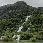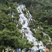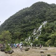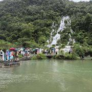 小七孔景区-翠谷瀑布这里群峰紧锁,群山苍翠欲滴,故名“翠谷”。小七孔景区-翠谷瀑布悬于群山之腰,是荔波小七孔景区落差较大的瀑布,瀑高60多米,远看似条玉带悬于山间,近探水顺山势倾泻而下,浪花飞溅,水雾蒙蒙,犹如群龙下山,清新悦目。