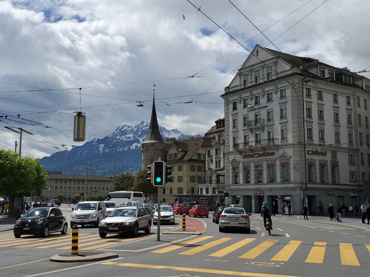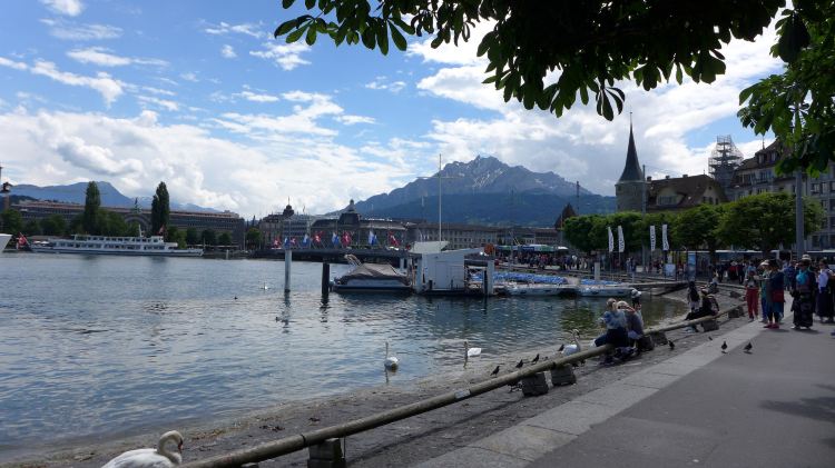 卡佩尔廊桥北侧不远就是有名的天鹅广场,是老城区的入口。主干道从广场前经过,多条公交线路经停。靠湖的一侧树荫下设有许多游人休息的椅子,湖边熙来攘往的行人、观光客川流不息,游弋在湖上的天鹅令人迷恋。