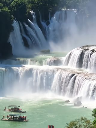 德天跨国瀑布景区位于中越边境广西壮族自治区崇左市,横跨中国和越南两个国家,宽度达200多米,是亚洲首屈一指的大瀑布,为世界第二跨国瀑布,也是影视剧《花千骨》的取景地之一。