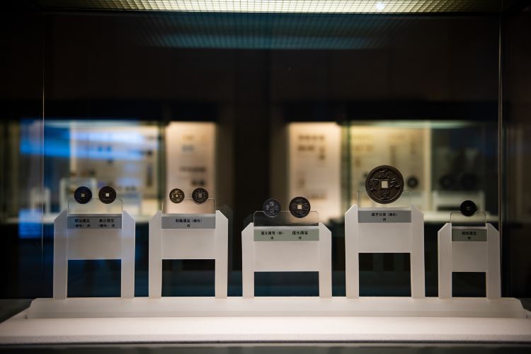 博物馆展示了从先秦时期的贝币、布币、刀币、圜钱,至秦汉及以后各朝的铜钱、银锭、纸币,各类特殊用途的古钱币500余枚。贝币是中国古代以海贝充当的原始货币,产生于距今三千年的商代,是钱币的始祖,由天然海贝加工而成;布币也是中国古代货币,因形状似铲,又称铲布,春秋时期出现,直至战国晚期铸行并流通的铲形货币。