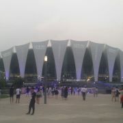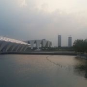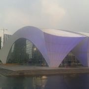 上海东方体育中心,别名“海上皇冠”,原名上海水上竞技中心,位于上海浦东新区,以水上项目为主的综合性体育场馆。共包括一座1.5万人的主体育馆,5千人的游泳馆和5千人的室外跳水池,总投资约20亿元人民币,于2010年底竣工,该场馆将主要为2011年上海世界游泳锦标赛服务。