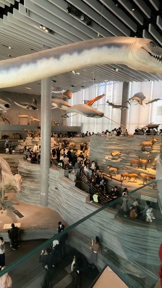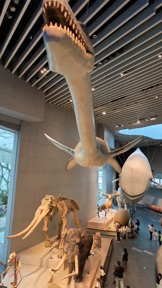 上海自然博物馆位于静安雕塑公园,场馆宛如一只“绿螺”,外观独特。如今的新馆内展出了上万件标本藏品,内容丰富,尤其以一副体长约26米的中加马门溪龙的骨架甚是抢眼。