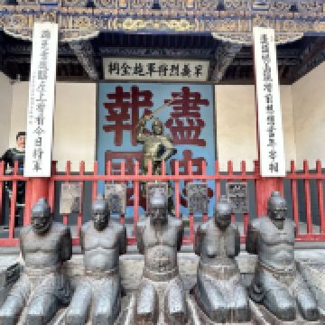 汤阴岳飞庙,原名精忠庙,也被成为“宋岳忠武王庙”,是后人为纪念南宋抗金名将、我国著名民族英雄岳飞而建。庙宇至今有六进院落,景区内含丰富,殿堂雄伟,碑碣林立。汤阴岳飞庙的临街大门为精忠坊,木结构,斗拱型制九踩四昂重翘。坊之正中阳镌明孝宗朱佑樘赐额“宋岳忠武王庙”,两侧墙上用青石碣分别刻有“忠”、“孝”两个大字。过了精忠坊是山门,座北朝南,三开间式建筑,两侧扇形壁镶嵌有滚龙戏水浮雕,门前一对石狮分踞左右。山门檐下一排巨匾,上书“精忠报国”、“浩然正气”、“庙食千秋”,是当代书法家舒同、肖劳的手迹。山门对面为施全祠,里面塑有施全的铜像(施全,南宋刺秦桧而闻名于世的义士,小说《说岳全传》中岳家军将领),对祠前秦桧、王氏、万俟、张俊、王俊五奸党铁跪像呈镇压之势。在林立的碑刻中,有明清帝王谒庙诗篇,更多的是历代文人学士颂扬英雄的诗词歌赋。穿过御碑亭,便是汤阴岳飞庙景区之主体建筑——正殿。正殿体态稳重,气势恢宏。殿门楣上悬有五块巨匾,分别是“乃武乃文”、“故乡俎豆”、“忠灵示泯”、“百战精威”、“乾坤正气”。其中“百战神威”和“忠灵未泯”为清帝光绪和太后慈禧所题。正殿中央为岳飞彩塑坐像,高丈余,英武魁伟,正气凛凛。上悬“还我河山”贴金巨匾。大殿两侧的东西庑中,是“岳飞史迹陈列室”。汤阴岳飞庙大殿后院,是寝殿、岳云祠、四子祠、岳珂祠、孝娥祠、三代祠等。寝殿上方悬有现代著名书法家商向前、沈鹏等题写的匾额和魏传统等的楹联,内陈列着著名的书法珍品《出师表》石刻。