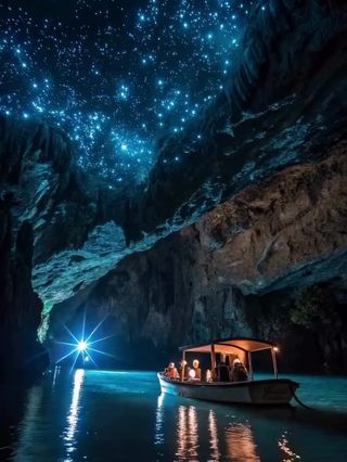 怀托摩萤火虫洞是新西兰北岛西部山区的石灰岩溶洞,也是新西兰的景区。毛利语中怀托摩是绿水环绕的意思。洞壁上,星罗棋布的绿色光点层层叠叠,这些绿光闪烁在黢黑水面上,光影翻倍,这是一个属于绿色精灵的奇妙世界。