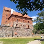 特拉凯城堡位于加尔瓦湖心岛上,原建于十四世纪末,是立陶宛知名的风景点。城堡由粉红色的砖石砌成,远观非常美丽,城堡面积不大,但城墙十分坚厚,城堡四周有瞭望望台,墙内有护城河。