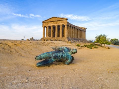神殿之谷Valle dei Templi,并非山谷,而是阿克里真托南面的一座山丘,地势险要,一面可远眺阿克里真托市区,一面坐拥山谷的绿地,眼界十分开阔。山头排列着赤色的古希腊神殿遗迹,神殿高大,非常气势,虽累遭天灾、战火及早期基督教徒的破坏,但保存相当完整。1997年根据文化遗产遴选标准C(I)(II)(III)(IV)被列入《世界遗产目录》。