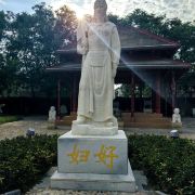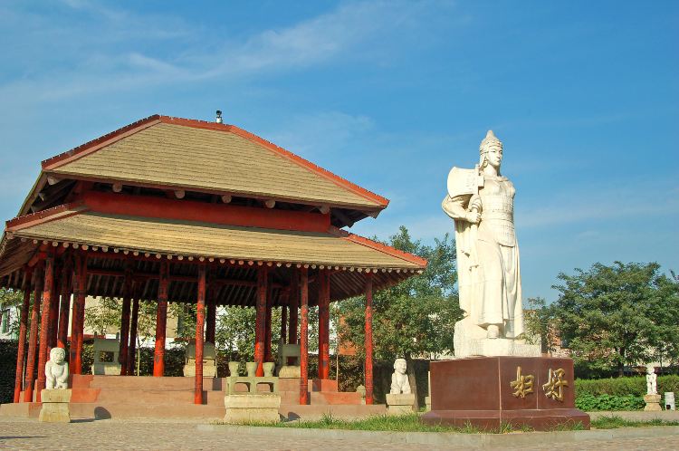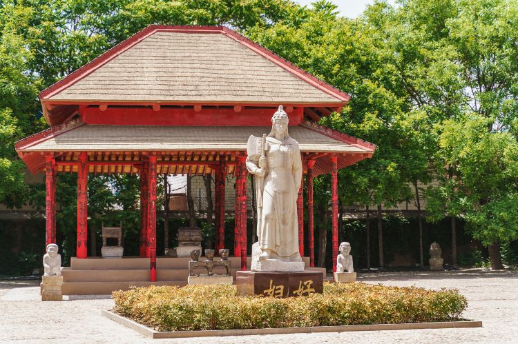 妇好墓即殷墟五号墓,位于殷墟宫殿宗庙遗址附近,是殷墟科学发掘以来发现的保存完整的商代王室成员墓葬。该墓是一竖穴墓,基口长5.6米、宽4米、深约8米,面积不大,仅为20多平方米,但随葬品极为丰富,共出土青铜器、玉器、宝石器、象牙器等不同质地的文物1928件,墓上建有被甲骨卜辞称为“母辛宗”的享堂。根据该墓的地层关系及大部分青铜器上的“妇好”铭文,考古学者认定墓主人为商王武丁的配偶——妇好。现位于妇好享堂前的汉白玉雕像是根据有关资料塑造的妇好形象,披坚执锐、目光炯炯,手持龙纹大铜钺,重8.5公斤,不愧为中国早的女将军,英姿飒爽、威风凛凛。而另一件虎纹铜钺重达9公斤,可见她武艺超群。在古代钺曾是王权的象征,这也说明妇好在殷商时期地位之高,很受尊敬。