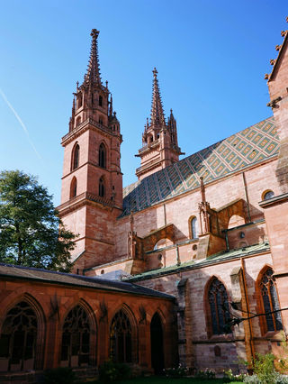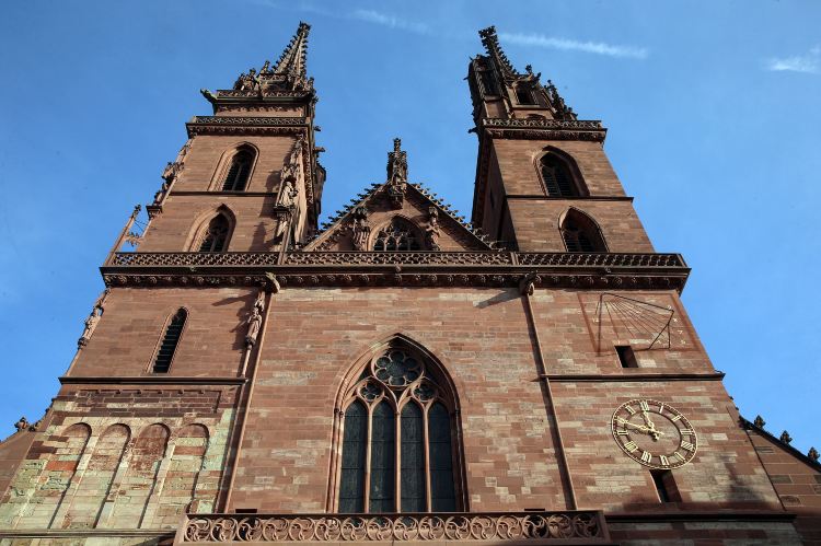 红沙岩砌成的高墙,五颜六色的瓦铺成的房顶,高耸的双塔,这一切的一切使大教堂成为巴塞尔重要的特色之一。酒窖、唱诗班、鹿特丹伊拉斯谟之墓、Galluspforte和两个回廊见证了大教堂几个世纪的沧桑。