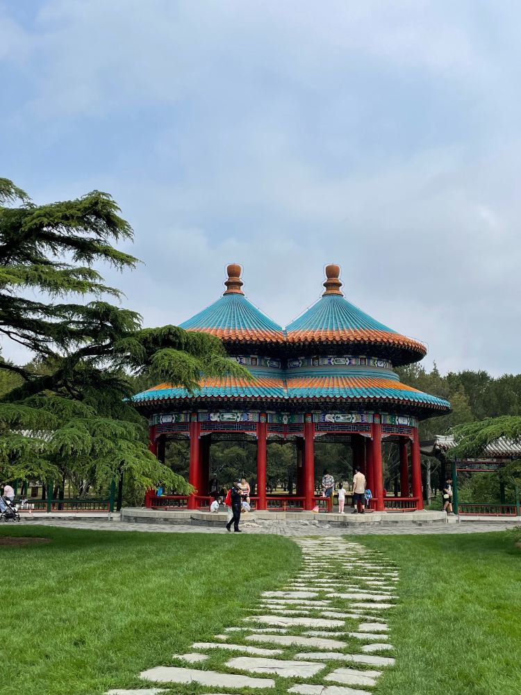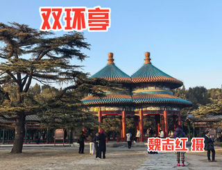 天坛公园里的双环万寿亭,位置在天坛公园西北部。双环万寿亭是乾陛皇帝为其母50大寿祝寿时所建,原址在北京中南海西岸。1976年整体移至天坛公园。它是由两个重檐八柱圆亭组成的双环亭,在国内古建筑中仅存一例。 双环亭端庄,凝重。孔雀琉璃瓦色彩明快,红色柱子和彩绘鲜艳悦目。 双环亭前有一大片没有围栏的草坪,辉映美丽的建筑,很少有人会进去踩踏。