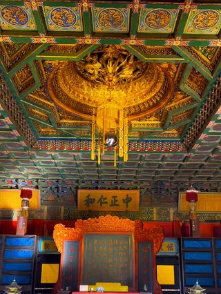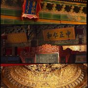 养心殿建于明代嘉靖年间,位于内廷乾清宫西侧。是一座工字形殿,前殿面阔7间,进深3间。每间各加方柱两根,外观似9间。养心殿是紫禁城中第一个装上玻璃的宫殿。皇帝的宝座设在明间正中,上悬雍正御笔“中正仁和”匾。明间东侧的“东暖阁”内设宝座,向西,这里曾经是慈禧太后垂帘听政处。明间西侧的西暖阁则分隔为数室,有皇帝看阅奏折、与大臣秘谈的小室,有乾隆皇帝的读书处三希堂,还有小佛堂、梅坞等,是专为皇帝供佛、休息的地方。现在养心殿完全按照原来的皇宫样式陈列,可以前去参观。