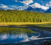 波密嘎龙寺在林芝市波密县扎墨公路冰川的海拔5500米处,寺庙建设在1950年,是一座古老的寺庙。站在嘎龙寺上向四面环视眺望,背后是高耸的山峰,一片铁杉针叶林郁郁葱葱,两侧是两条山谷冰川,晶莹耀眼,俯视下方是开阔的盆地平坝,一片草甸沼泽,牛群悠闲,风光如画。