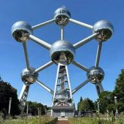 原子球塔位于布鲁塞尔市西北郊易明多市立公园内、是比利时工程师安德鲁·瓦特凯恩(AndréWaterkeyn)于1958年为布鲁塞尔万国博览会设计的,现在已经成为有代表性的比利时地标建筑。标新立异结构这座原子球塔采用了放大了1650亿倍的α铁的正方体晶体结构,由9个直径18米的铝质大圆球组成,每个圆球代表一个原子,也代表当年比利时的9个省,各球之间由空心钢管连接,钢管每根长约29米。9个圆球加上钢架结构总重量为2200吨,高的一个球体离地面102米。每个球表面都是用5800块三角弧形铝片焊接而成。在阳光照耀下,这座气势雄伟的建筑银光闪烁,称得上是一件标新立异的科学艺术品。顶球远眺目前原子球塔有4个球对公众开放,其他球体用于研究工作或租赁。从地面圆形接待大厅可搭乘升降式电梯直达高的顶球。这部电梯速度高达5米/秒,是欧洲运行速度快的电梯。顶球供游客观赏风景,四周为一圈固定的钢化有机玻璃窗,并设有多架望远镜。在顶球远眺,整个布鲁塞尔市远近建筑一览无遗:布鲁塞尔市政厅、圣心国家圣殿、迷你欧洲等建筑都尽收眼底。参观导览从顶球下来,沿球间斜行的金属管道可依次下到其它各球。这些球体内分门别类地陈列着太阳能、原子能、航天技术、天文类的展品,还有比利时气象事业发展史的图表。在六层的观景台,你可以从一个非常独特的角度观赏原子球塔和其中的5个球,非常有意思。美味餐厅顶球的上半层设有观景餐厅,窗外的风景十分迷人。餐厅正午时间只对团队开放,但你可以在此享用晚餐,建议提前预约,在离地面100米的高空就餐是难忘的经历。原子球塔的底层设有餐吧,如果累了可以来这里休息,补充能量。位于同层的纪念品商店同样不可错过,这里的各种原创马克杯、耳环、钢笔都十分别出心裁,可以酌情选购。每当夜幕降临,每个圆球外面的9圈灯泡交替追逐发光,奇妙的灯光点缀着布鲁塞尔的夜景,很值得一观哦。