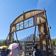 禾木桥是一座非常有当地特色的全木制桥,或宽或窄的木条铺成桥面,有的地方已有破损,站在上面可以很轻易地透过或大或小的缝隙看见桥下奔流的河水。这里夕阳非常美丽,桥面被镀上金光的那一刻。跨过禾木桥之后,河对岸是白桦林。